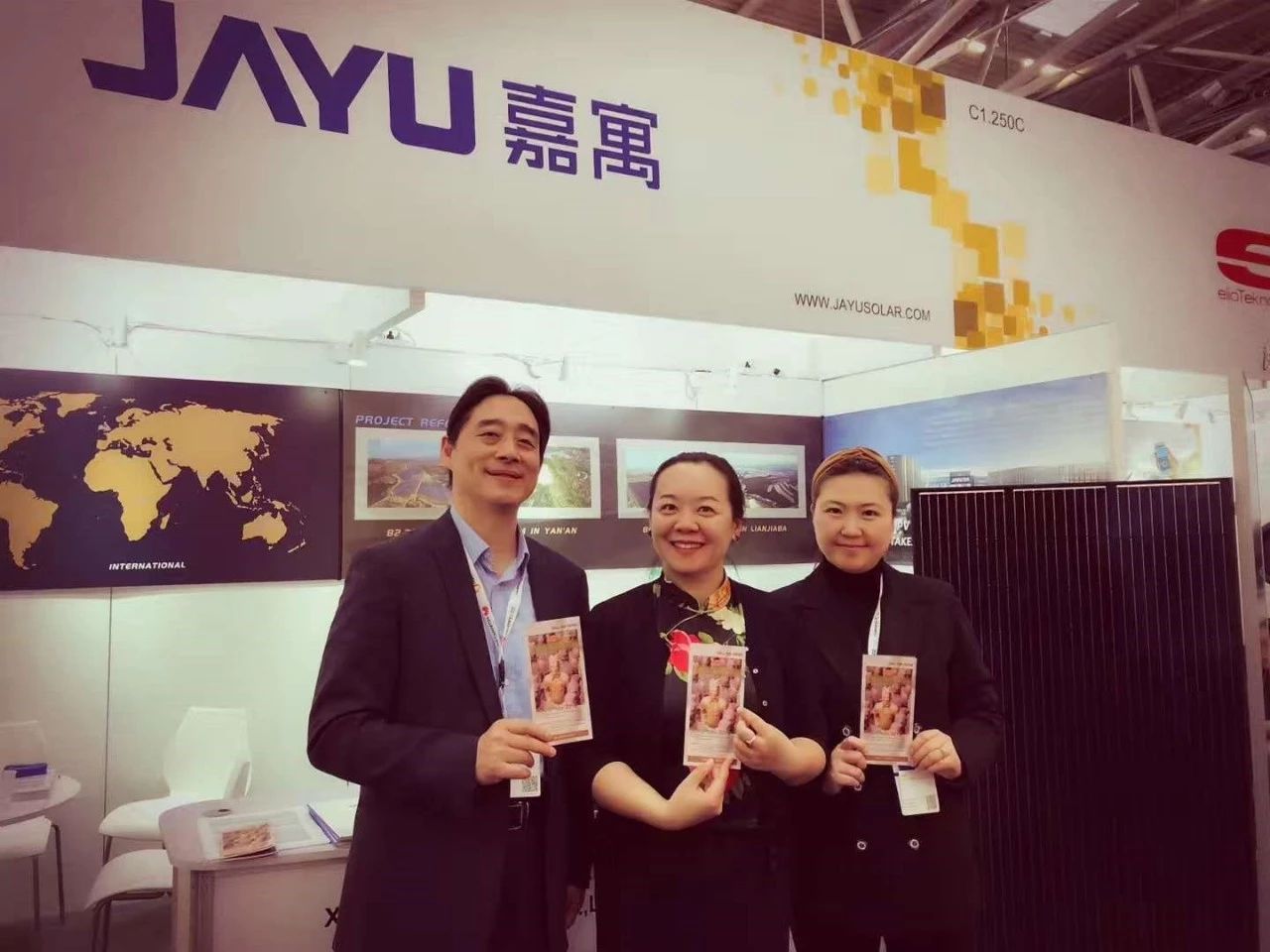 嘉寓光能本次參展由總經(jīng)理陳志榮先生親自帶隊(duì),攜嘉寓光能業(yè)務(wù)副總?cè)椒?、業(yè)務(wù)總監(jiān)車競(jìng)以及海外業(yè)務(wù)部門多位高管,組成了參加展會(huì)的核心團(tuán)隊(duì),奔赴德國慕尼黑。本次嘉寓光能在2019年德國慕尼黑國際太陽能展展示了半片系列光伏組件、雙玻系列光伏組件以及全黑光伏組件系列。三款系列產(chǎn)品采用了嘉寓光能最新的高效技術(shù),功率均突破了400W,光伏組件的4.0時(shí)代,嘉寓光能已經(jīng)有了一席之地。尤其是半片系列光伏組件,最高功率可達(dá)450W,成為國內(nèi)外友人討論的焦點(diǎn)之一,是嘉寓光能在本屆展會(huì)中當(dāng)之無愧的“明星產(chǎn)品”。在為期三天的展會(huì)中,嘉寓光能和三款系列產(chǎn)品組件吸引了眾多業(yè)內(nèi)人士的關(guān)注,并接受了來自多個(gè)國家項(xiàng)目方的咨詢,活動(dòng)現(xiàn)場(chǎng)與我方達(dá)成了初步的合作意向的客戶鱗次櫛比。
